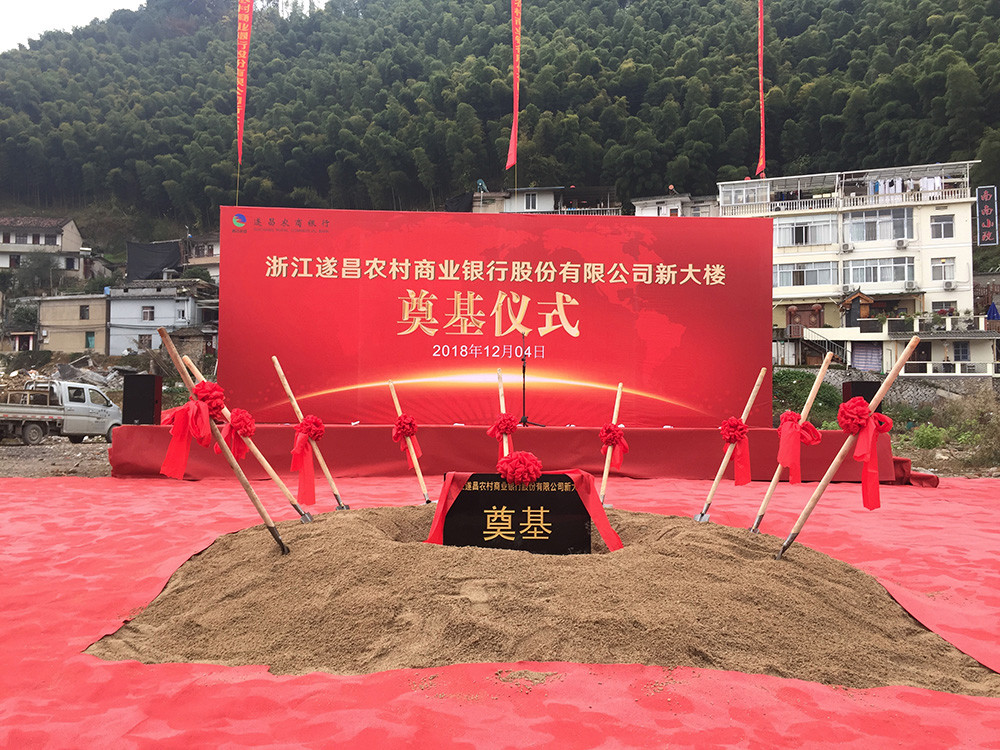 2018年12月04日上午,我司承建的遂昌農村商業銀行辦公大樓工程順利舉行開工奠基儀式。參加儀式的有:遂昌縣委常委、常務副縣長許積標,省農信聯社麗水辦事處副主任方曙,遂昌縣發展和改革局局長潘光明,遂昌縣住房和城鄉建設局局長徐根耀,遂昌縣國土資源局局長周世岳,中國人民銀行遂昌腳支行行長林衛平,遂昌農商銀行董事長余振榮等領導。我司總經理鐘鳴在開工儀式上發言:努力把遂昌農村商業銀行辦公大樓項目建成質量一流的優質工程、樣板工程。